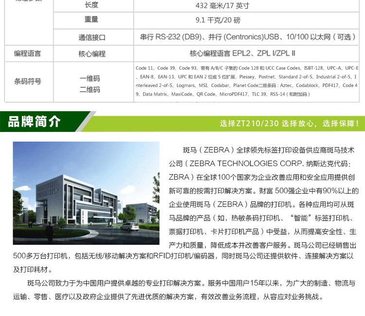 可选软件ZebraDesigner™ ProZebraNet® Bridge EnterpriseZebraNet® Setup Utilities v 7.0ZBI 2.0™ ZBI-Developer™可选连接ZebraNet® b/g/n 无线打印服务器(内置)ZebraNet 10/100 打印服务器(内置或外置)Centronics® 并行端口(内置)固件ZPL II®Zebra 全球打印解决方案EPL2™(2012 年晚些时候)Web View 和警告ZBI 2.0(可选)条码码型条码:Code 11、Code 39、Code 93、带有 A/B/C 子集的 Code 128 和 UCC Case Codes、ISBT-128、UPC-A、UPC-E、EAN-8、EAN-13、UPC 和 EAN 2 位或 5 位扩展、Plessey、Postnet、Standard 2-of-5、Industrial 2-of-5、Interleaved 2-of-5、Logmars、MSI、Codabar、Planet Code二维条码:Aztec、Codablock、PDF417、Code 49、Data Matrix、MaxiCode、QR Code、MicroPDF417、TLC 39、RSS-14(和附加码)字体和图形七种点阵字体,一种平滑向量字体(CG TriumvirateTM 粗体压缩字) 包括 Agfa Monotype Corporation 的 UFST®为 EMEA 字符集预装符合 Unicode™ 的可伸缩字体支持下列代码页的国际字符集 IBM® Code Page 850支持用户定义的字体与图形 — 包括定制徽标ZPL II 绘图命令 — 包括方框与线条